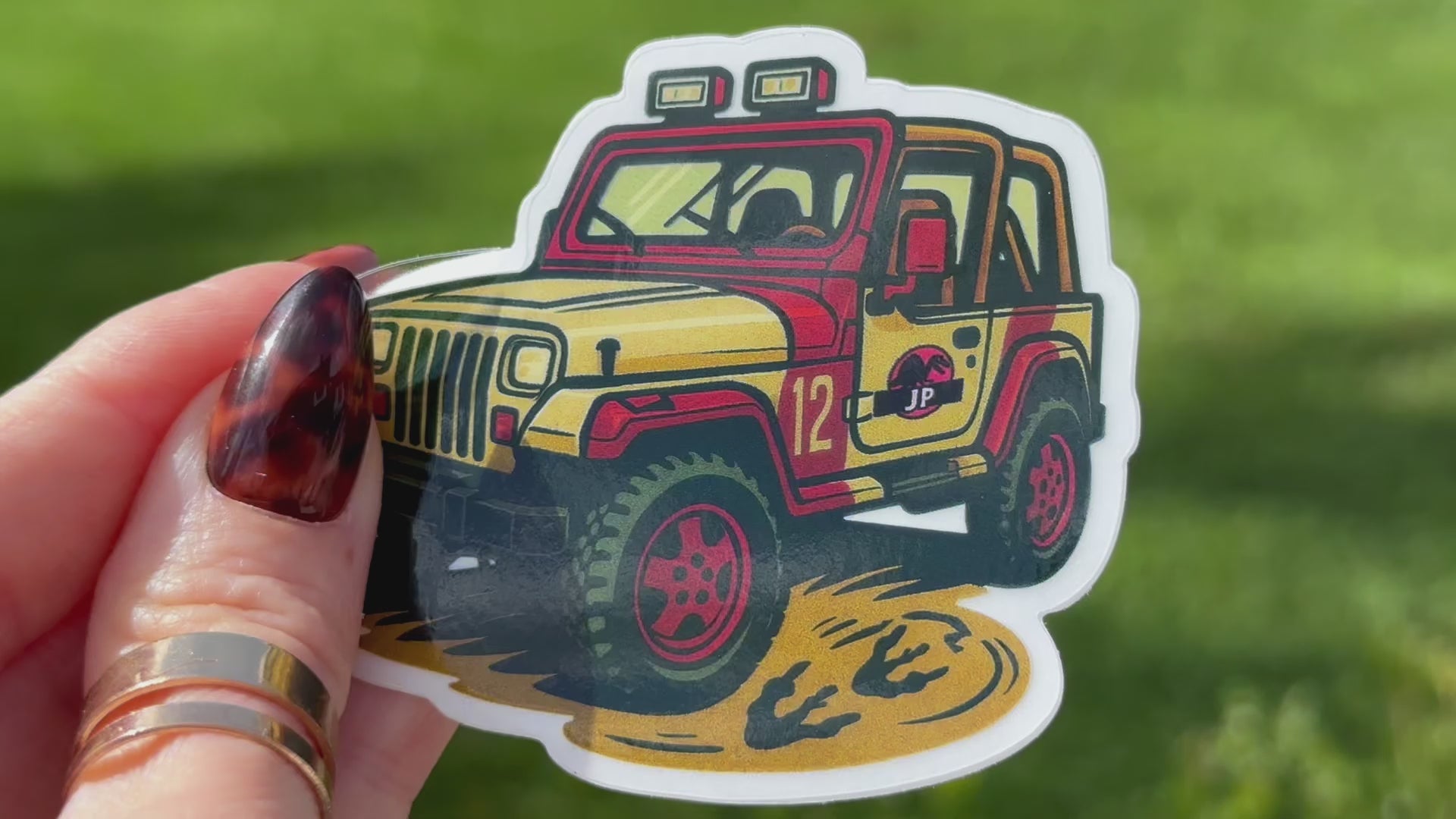 The classic Jurassic Park Jeep — parked, suspiciously quiet, and flanked by ominous dinosaur footprints. Which can only mean one thing: something big just walked by... and it definitely saw you first.